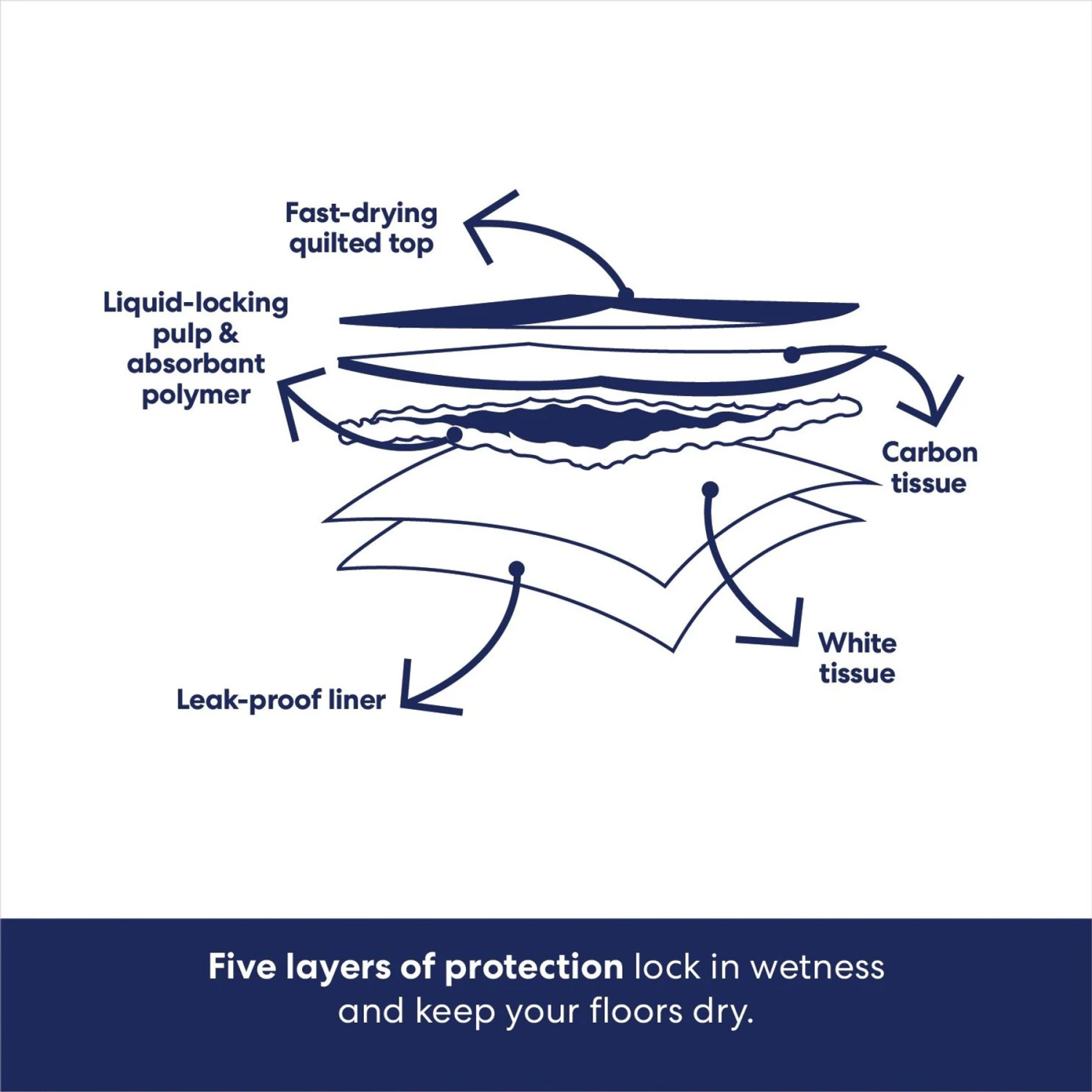 - Five layers of super absorbent protection lock in wetness while a leak-proof plastic lining prevents moisture from contacting your floor so cleanup is easy.