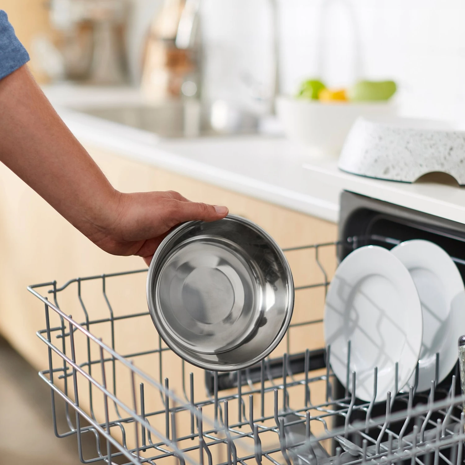 - Stainless-steel bowl comes out of the decorative base for easy cleaning.